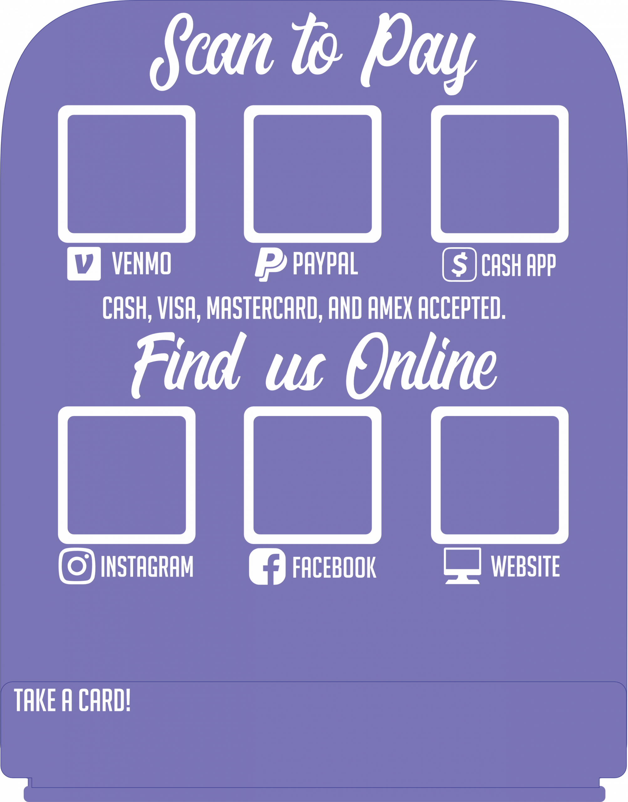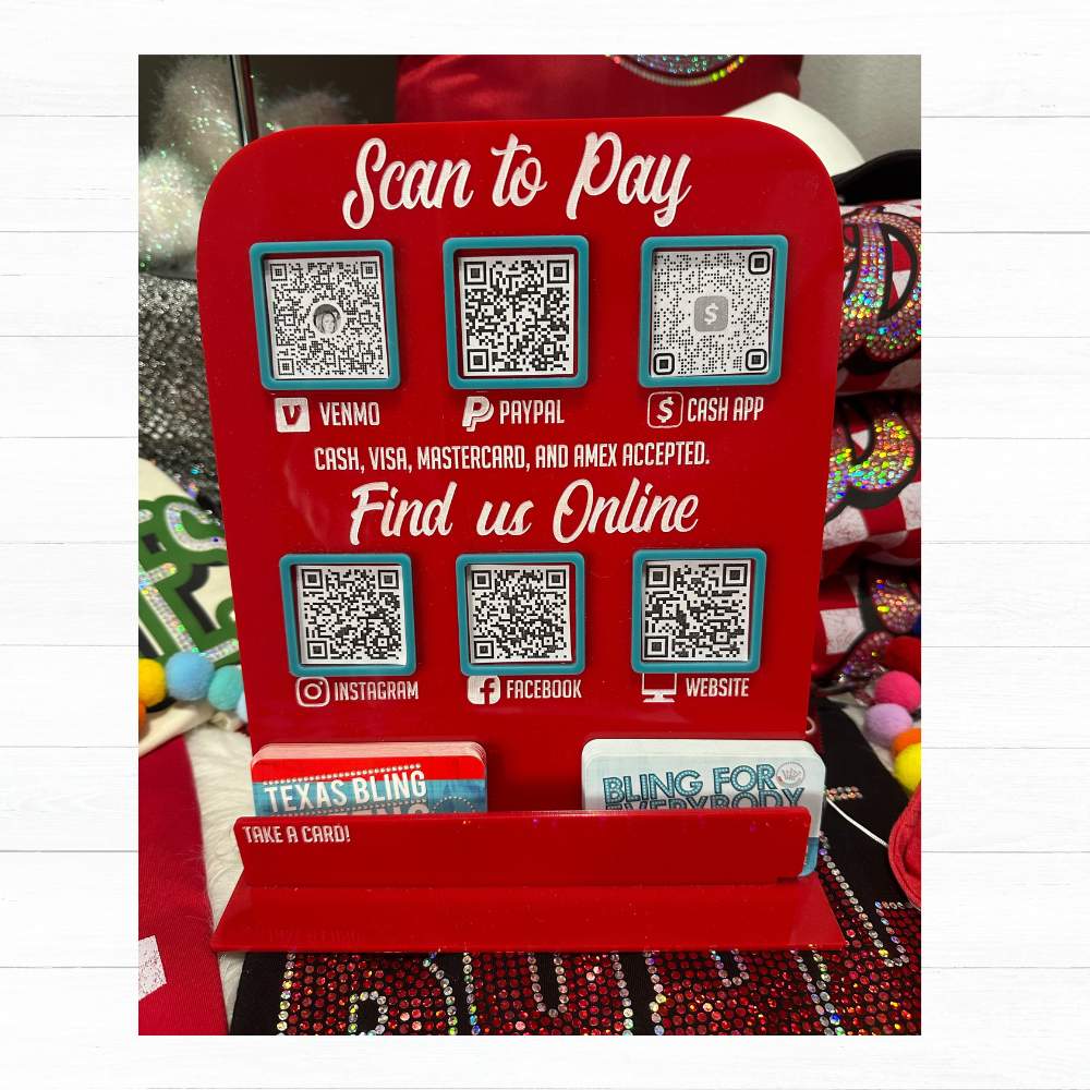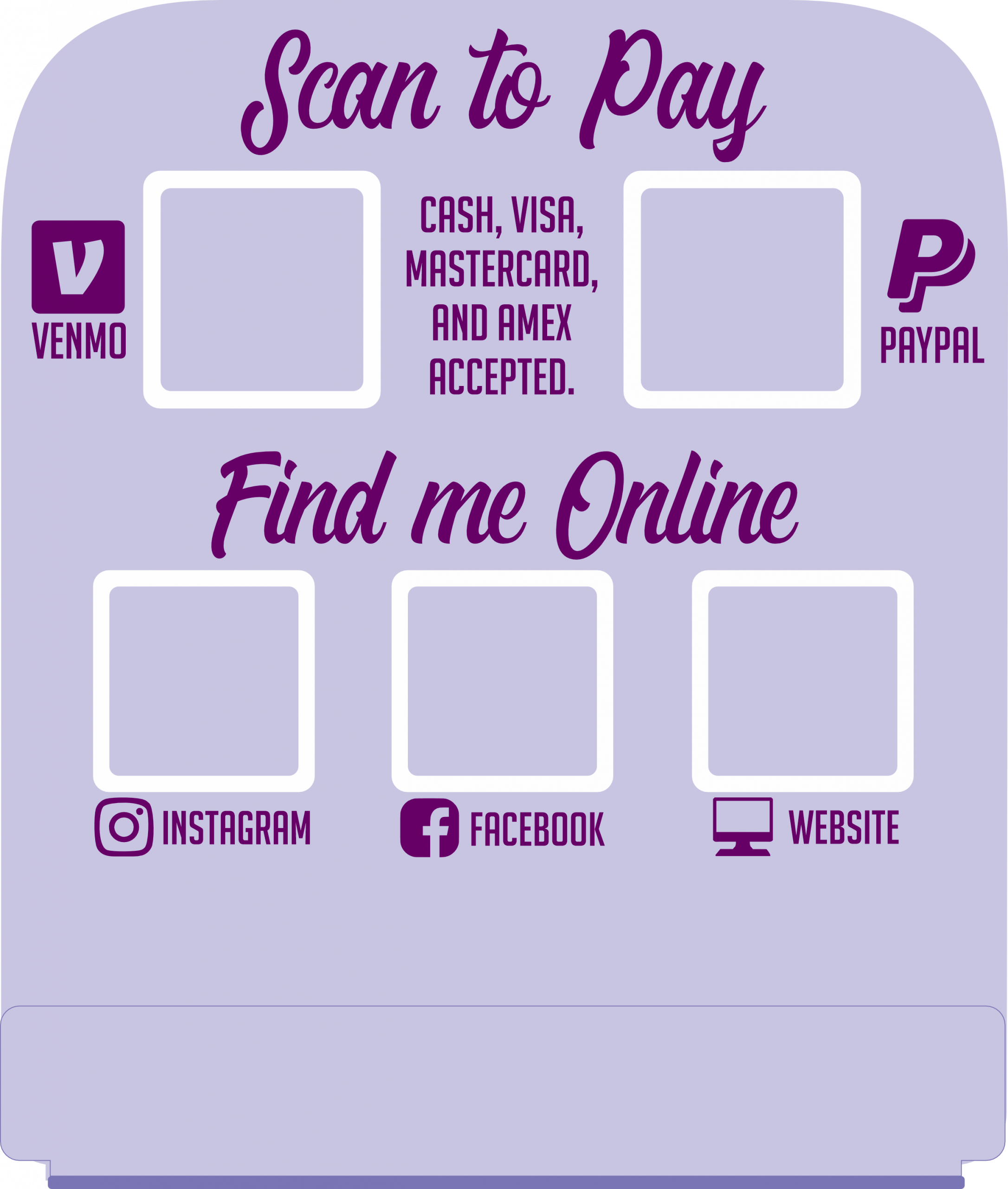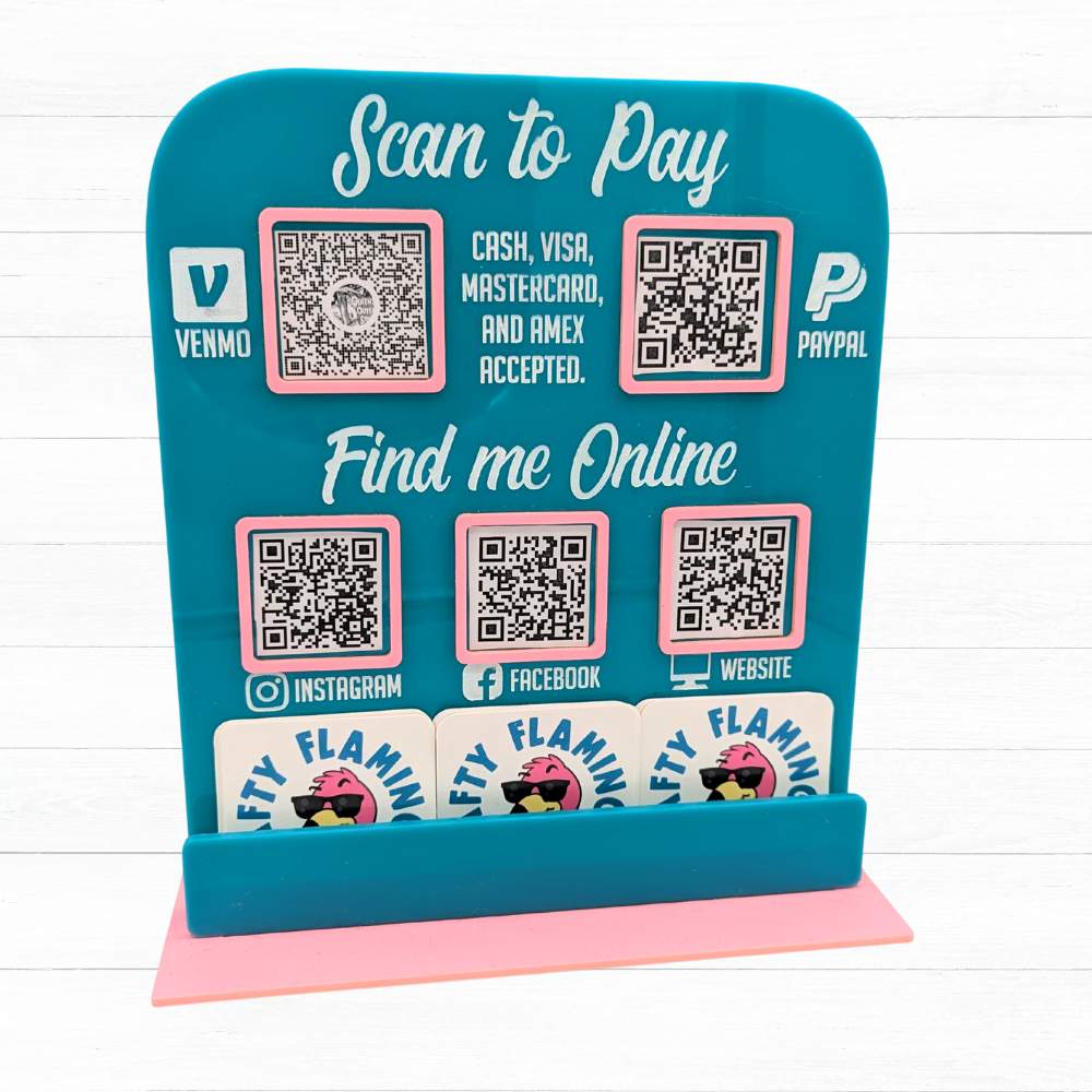 ❤ Great for Public Shows or to have near the Cash Register. This Scan to Pay Digital Download contains two options – one has 3 payment options and 3 social options, as well as a built in business card holder and the other has 2 payment options and 3 socials.